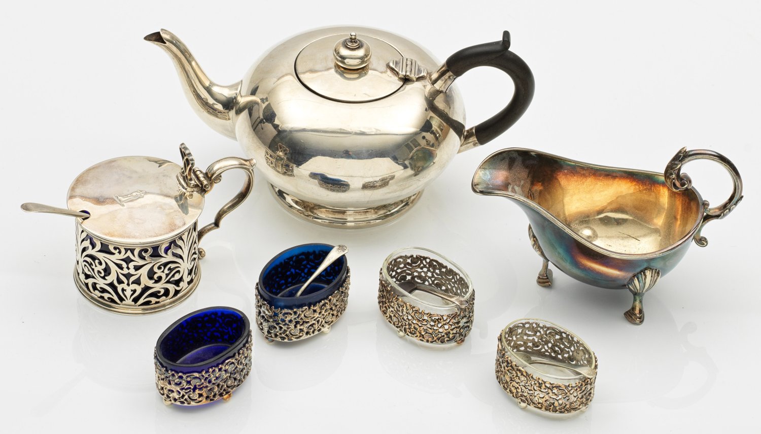 An English Edward VII teapot and a victorian mustard pot with spoon. Four plated salieres and a sauceboat added. Various assay marks, maker´s marks and date letters.