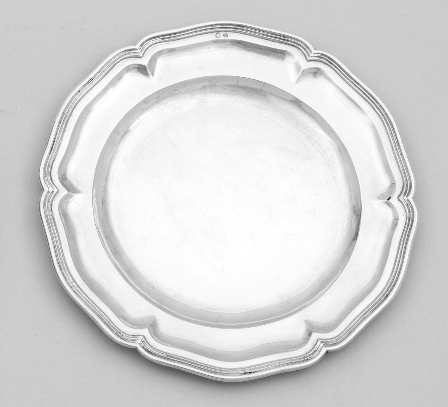 Silber. Rund, in klassischer Chippendaleform. Gering vertiefter, glatter Spiegel, übergehend in breite Fahne. Blütenförmig geschweifter, mehrfach profilierter Rand. Minim. besch.; Gest., Beschauzeichen, unbekanntes Meisterzeichen "HH". Gew. ca. 250 g. D. 22 cm.