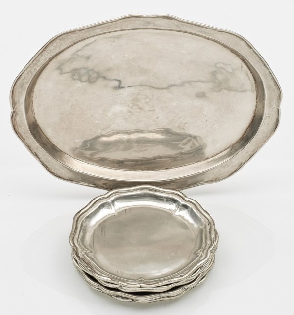 Silber sowie Sterlingsilber. Runde bzw. ovale, gering gemuldete Form mit schmalem, passig blütenförmig geschweiftem und gering ausgestelltem Rand. Gest. 800, 925, Beschaumarken. Gew. zus. ca. 470 g. D. 10 cm. 18,5 cm x 13,5 cm.