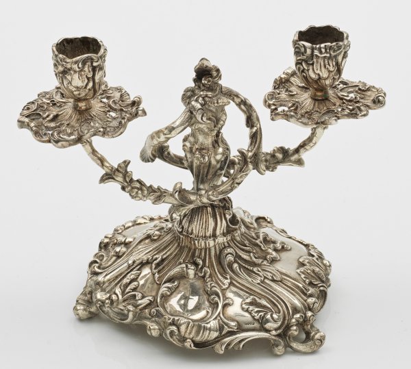 A small German Rococo style 2-light girandole. Standard mark 800.