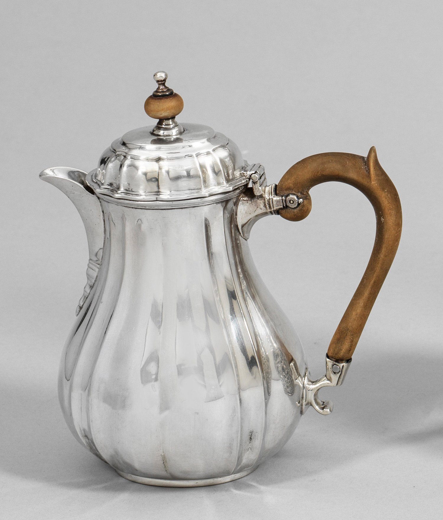 Silber. Birnförmig über flachem Stand. Wandung unterteilt durch geschweifte und gekniffene Züge. Korrespondierender, haubenförmiger Scharnierdeckel mit Balusterknauf und gering ausgestelltem, geschweiftem Rand. Tief angesetzter Konsolausguss. Ohrenhenkel aus hellbraunem Holz. Gest., Beschaumarken, Herstellerzeichen, Jahresbuchstabe "H", Händlermarke "Hinks and Radcliffe". Gew. ca. 245 g. H. 16,5 cm.