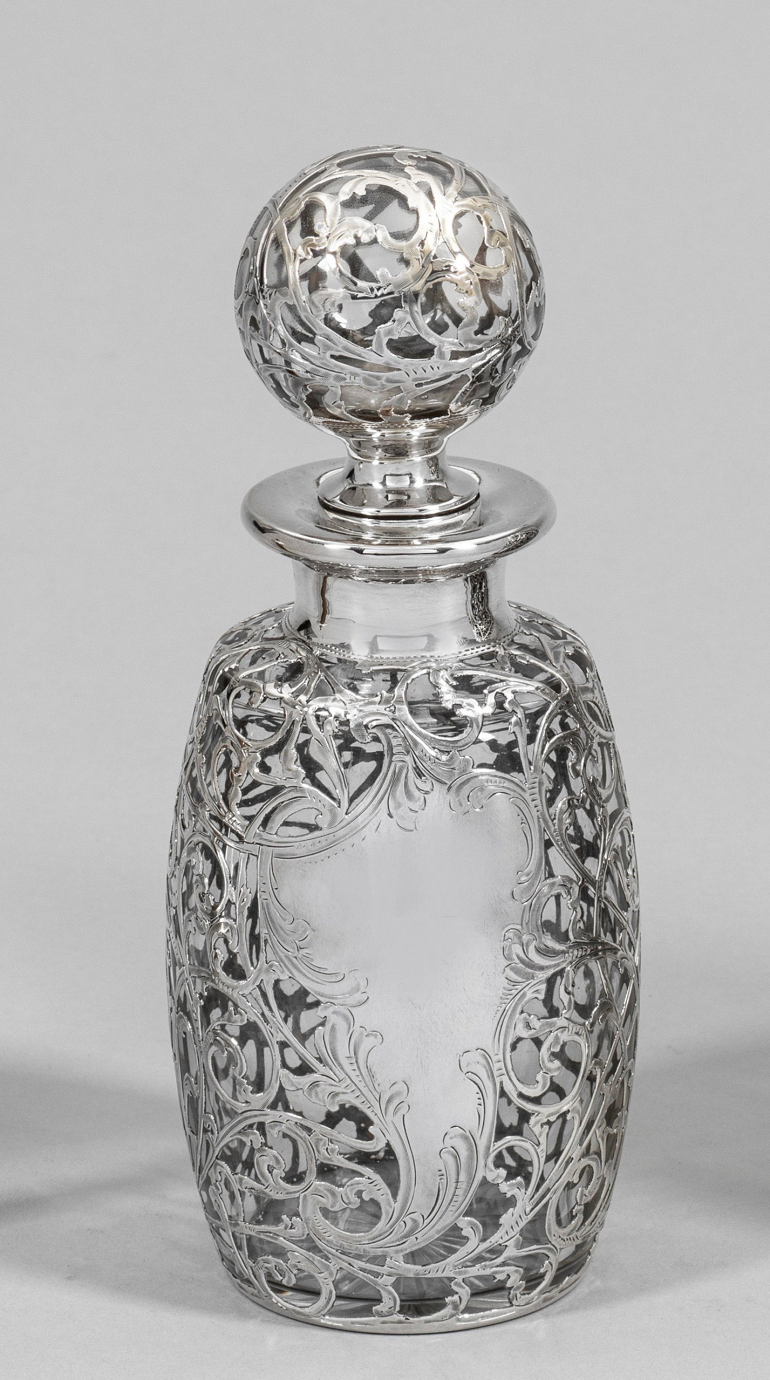 Silber und farbloses Glas. Konischer, gering bauchiger Korpus, übergehend in abgesetzte Schulter mit kurzem, gekehltem Hals und Stopfen mit großer, hohlgearbeiteter Kugel. Korpus und Stopfen nahezu flächendeckend mit feinem Silberüberfang aus reliefiertem und ziseliertem Ranken- und Akanthusblattdekor verziert. Schauseitig, passig geschweifte, freie Kartusche. Gest. "Solid Silver Pat. Jan. 5-86." sowie Modell-Nr. 1405. H. 21,5 cm.