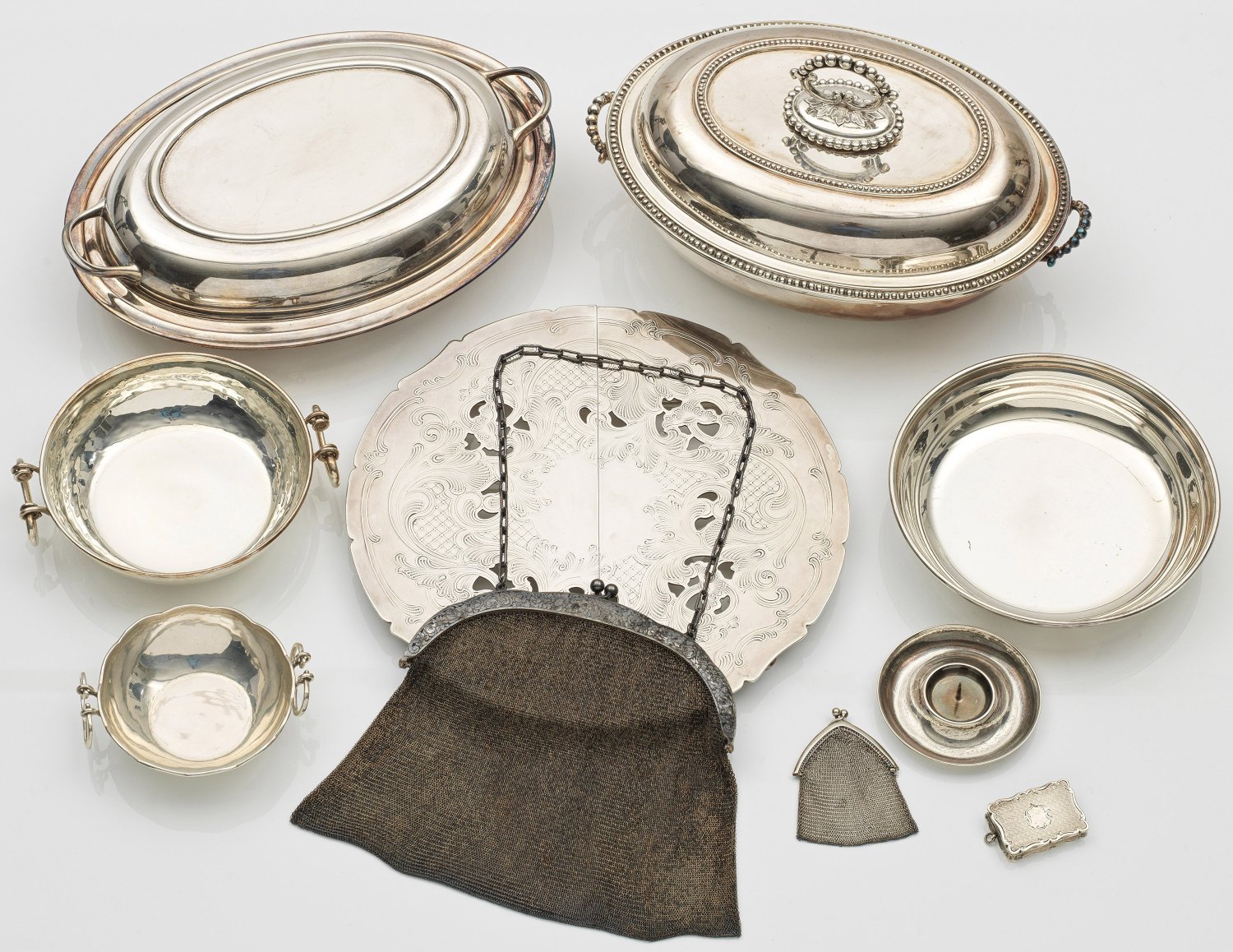 Plated und Silber. 10-tlg.; Untersetzer, zwei Deckelterrinen, drei Schalen, Kerzenhalter, zwei Handtaschen und ein Anhänger. Teilw. gest. 925, 800, Beschaumarken und Jahresbuchstabe. Div. Herstellerzeichen. Gew. zus. 5515 g.