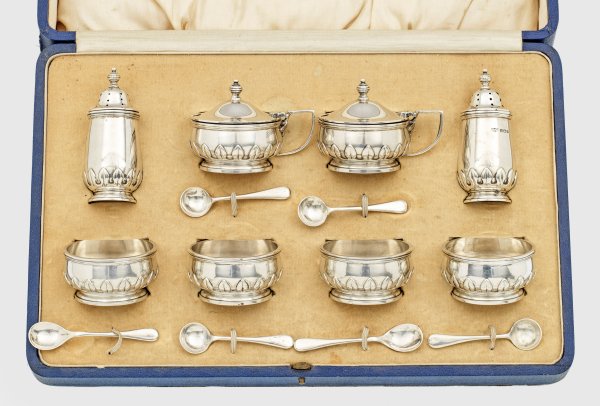 im Original-Etui. Silber. 14-tlg.; Ein Paar Gewürzstreuer, vier Salieren sowie zwei Senftöpfchen je mit passendem Löffel. Gering ausgestellter, runder Stand, übergehend in bauchigen, glatten Korpus. Am Ansatz umzogen von stilisiertem, reliefplastischem Blattfries. Gest. Beschaumarken, Herstellerzeichen, Jahresbuchstaben. Gew. zus. ca. 585 g. H. 3 cm - 8,5 cm.