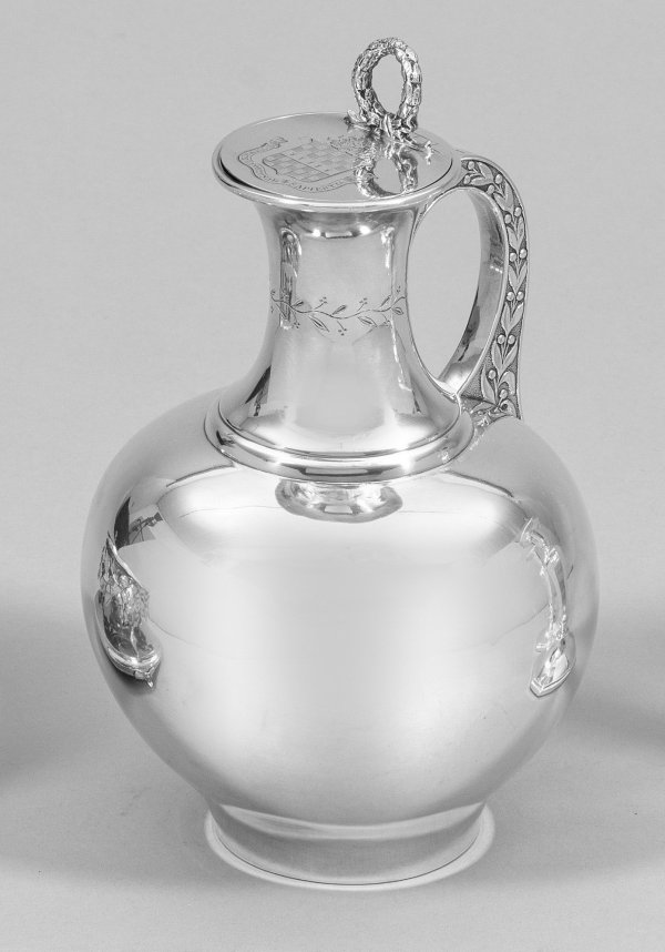 Silber. Bauchig ausschwingender Korpus mit stark eingezogener Schulter und sich konisch verjüngendem, schlankem Hals mit gravierter Blattranke. Gekanteter Henkel verziert mit stilisiertem Lorbeerblattrelief. Flacher Scharnierdeckel mit plastischem Lorbeerkranz als Daumenrast und mit graviertem Wappen und Spruchband "Victrix Fortunae Sapientia". Minim. best.; Gest., Beschaumarken, Herstellerzeichen, Jahresbuchstabe "n". Gew. ca. 480 g. H. 22 cm.