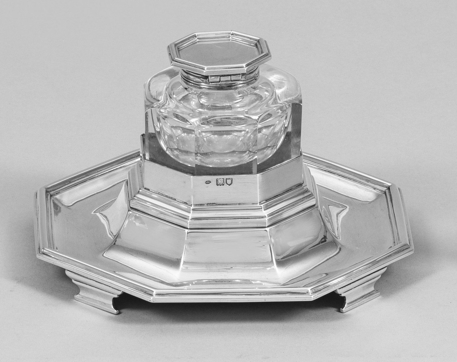 Silber und farbloses Glas, geschliffen. Auf vier schmalen Füßen, fein gemuldete, achtfach gekantete und facettierte Schale mit profiliertem, gering ausgestelltem Rand. Zentral aufsteigender, mehrfach gestufter und gegliederter Sockel mit montiertem, achtfach facettiert geschliffenem, massivem Tintenfass aus Glas mit gerundeter Schulter. Silbermontierter, flacher Scharnierdeckel mit korrespondierender Randzone. Gest., Beschaumarken, Meister Robert Frederick Fox sowie Tiffany & Co, Jahresbuchstabe "p". Gew. ca. 1125 g. H. 11 cm. 18 cm x 18 cm.