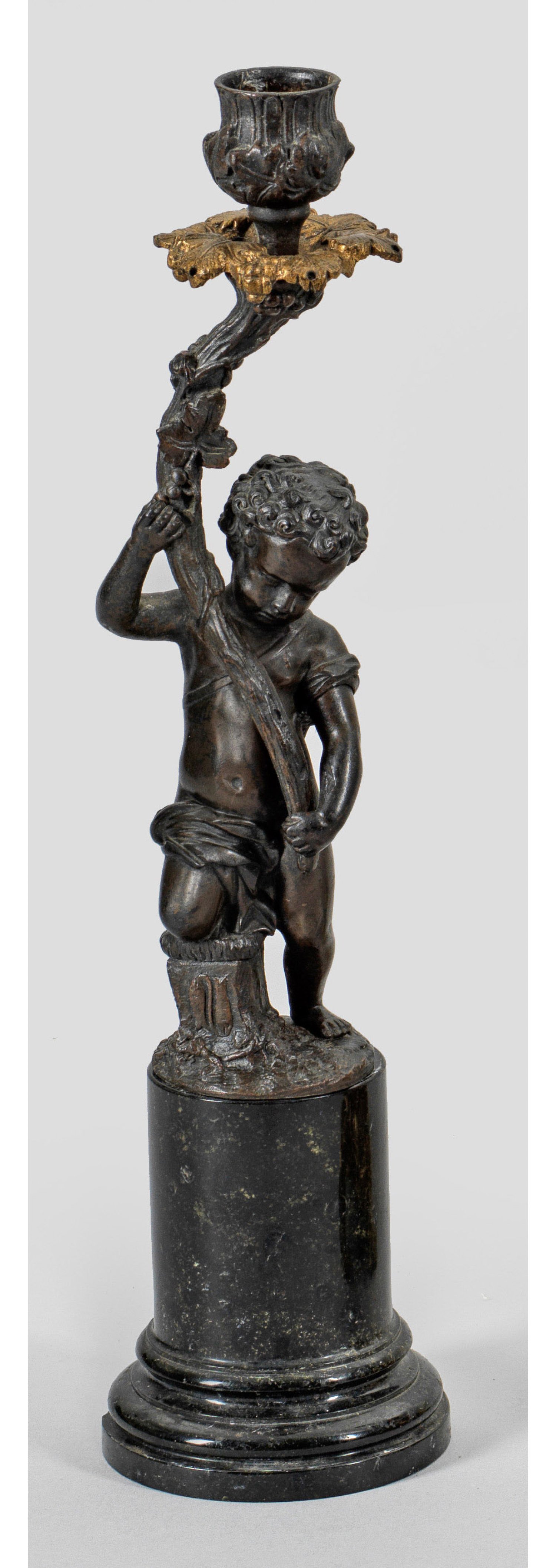 1-flg.; Grün gemaserter Serpentin und Bronze, dunkel patiniert. Über profiliertem Rundsockel zylinderförmiger Schaft. Oberhalb vollplastische Darstellung eines Puttos mit stilisiertem Füllhorn als Träger für vasenförmige Tülle. H. 33,5 cm.