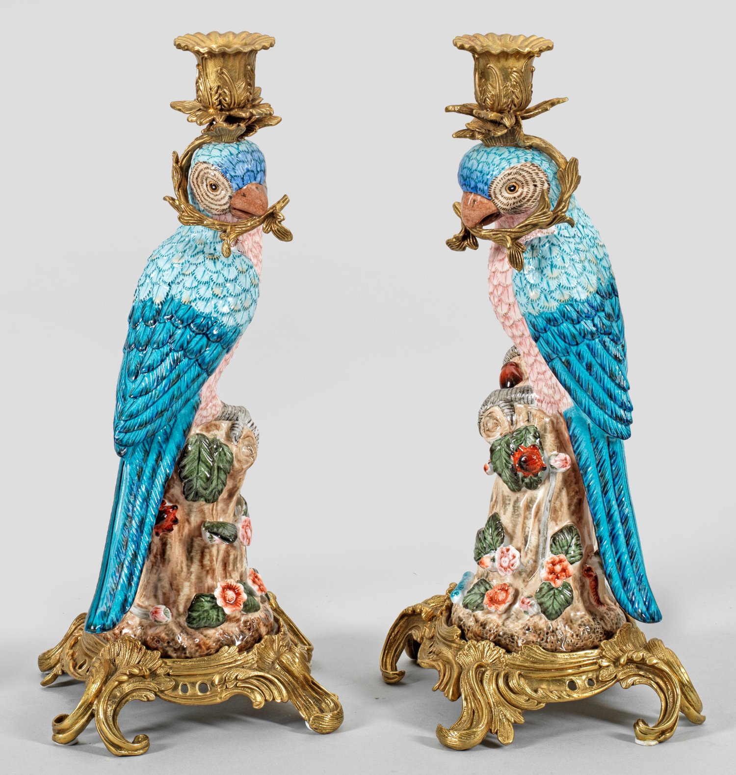Gegenstücke. 1-flg.; Porzellan, polychrom staffiert und Messing. Über Rocaillesockel naturalistisch gestalteter Schaft. Oberhalb vollplastische Darstellung eines Papageis als Träger für vasenförmige Tülle. Bez. bekrönte Wappenkartusche WL. H. 36,5 cm.