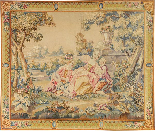 Wolle in unterschiedlichen Beige-, Grün- und Rosétönen, flach gewebt. Flächendeckende Darstellung einer weiten Parklandschaft mit zentraler Szenerie einer jungen Dame beim Bekränzen einer ihrer Verehrer nach dem 1755 entstandenen Gemälde "La coquette fixée" von Jean-Honoré Fragonard (1732-1806). Umlaufend breite Bordüre aus Gitterwerk sowie Muschelmotiven und Blüten. Hinterlegt. 185 cm x 221 cm.