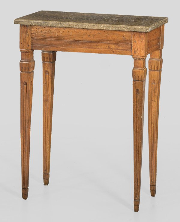 Nussbaum. Gerade Zarge auf konischen Vierkantbeinen. Gering überstehende Deckplatte aus grau gemasertem Marmor. Besch.; H. 76 cm. 57 cm x 33 cm.