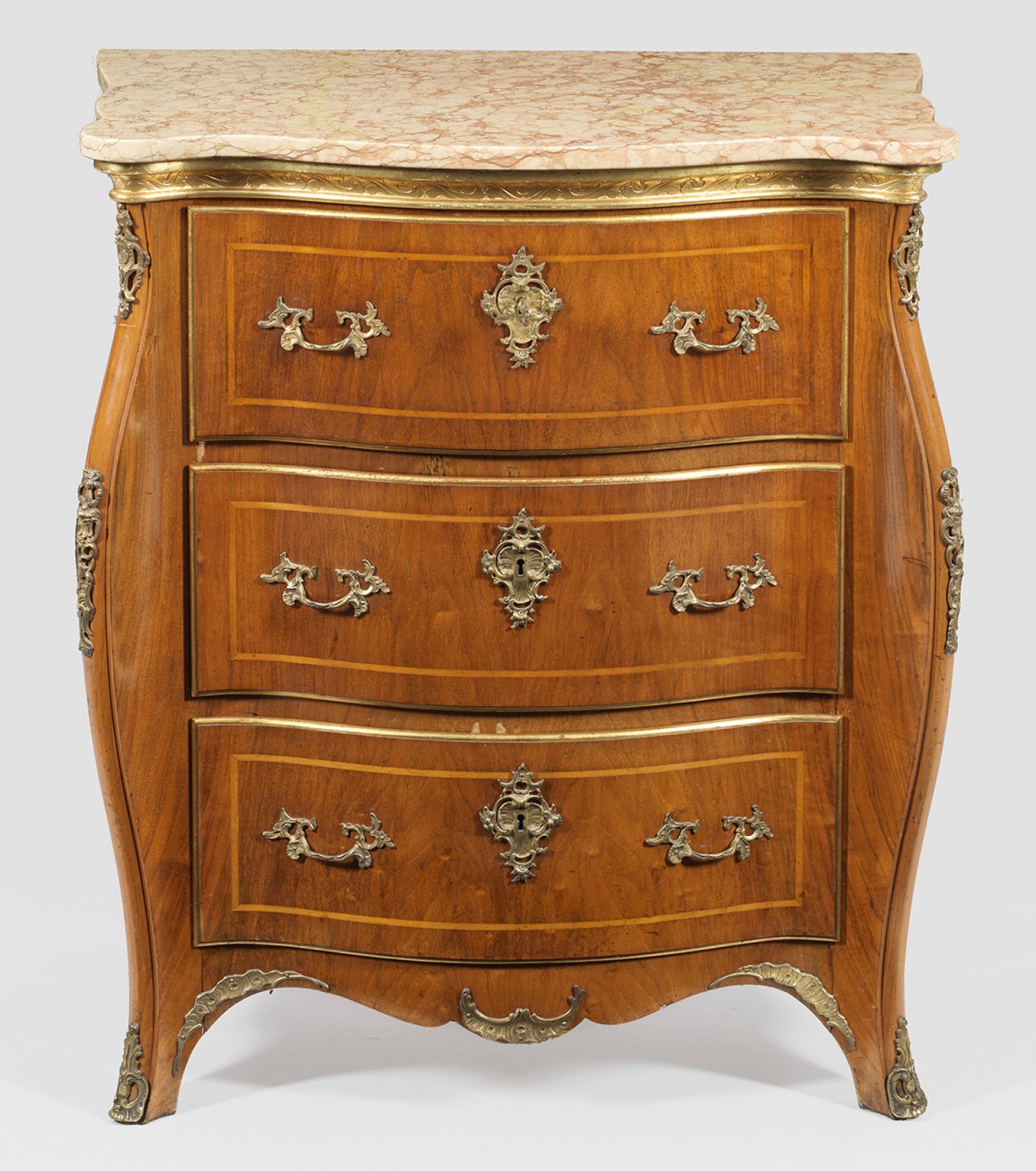 Nussbaum, furniert sowie teilw. gefasst und vergoldet. Dreiseitig bombierter Korpus, flankiert von weit ausgezogenen Ecklisenen, in entsprechende Füße übergehend. In der gegliederten Front drei Schubladen. Applikationen aus Bronze sowie Deckplatte aus creme- und roséfarben gemasertem Marmor. H. 88 cm. 75 cm x 47 cm.