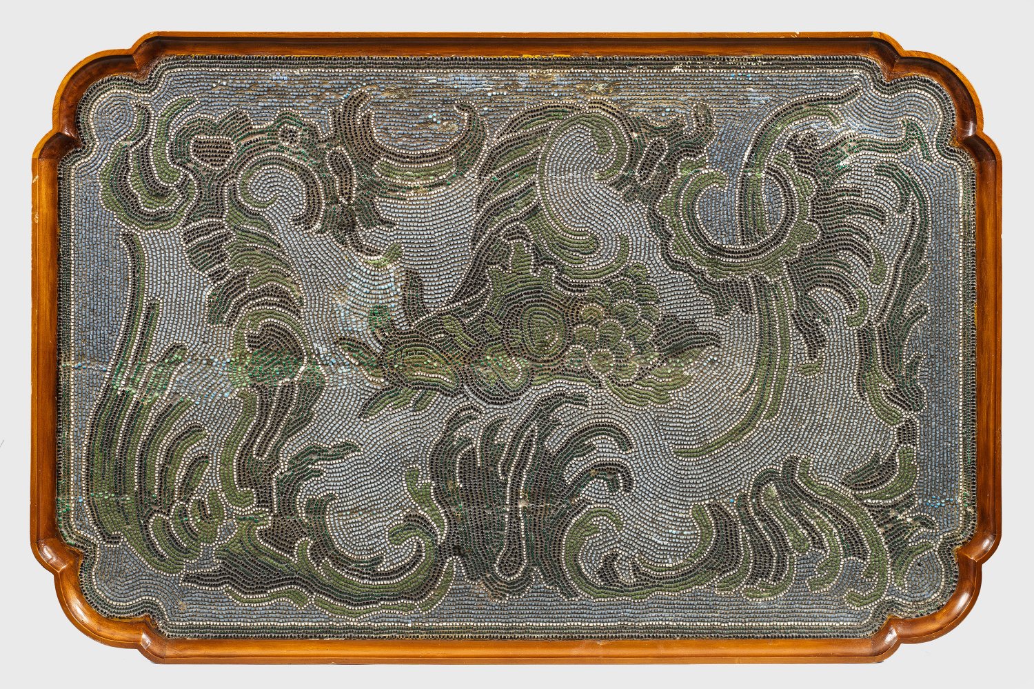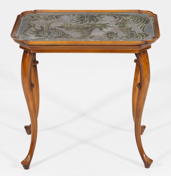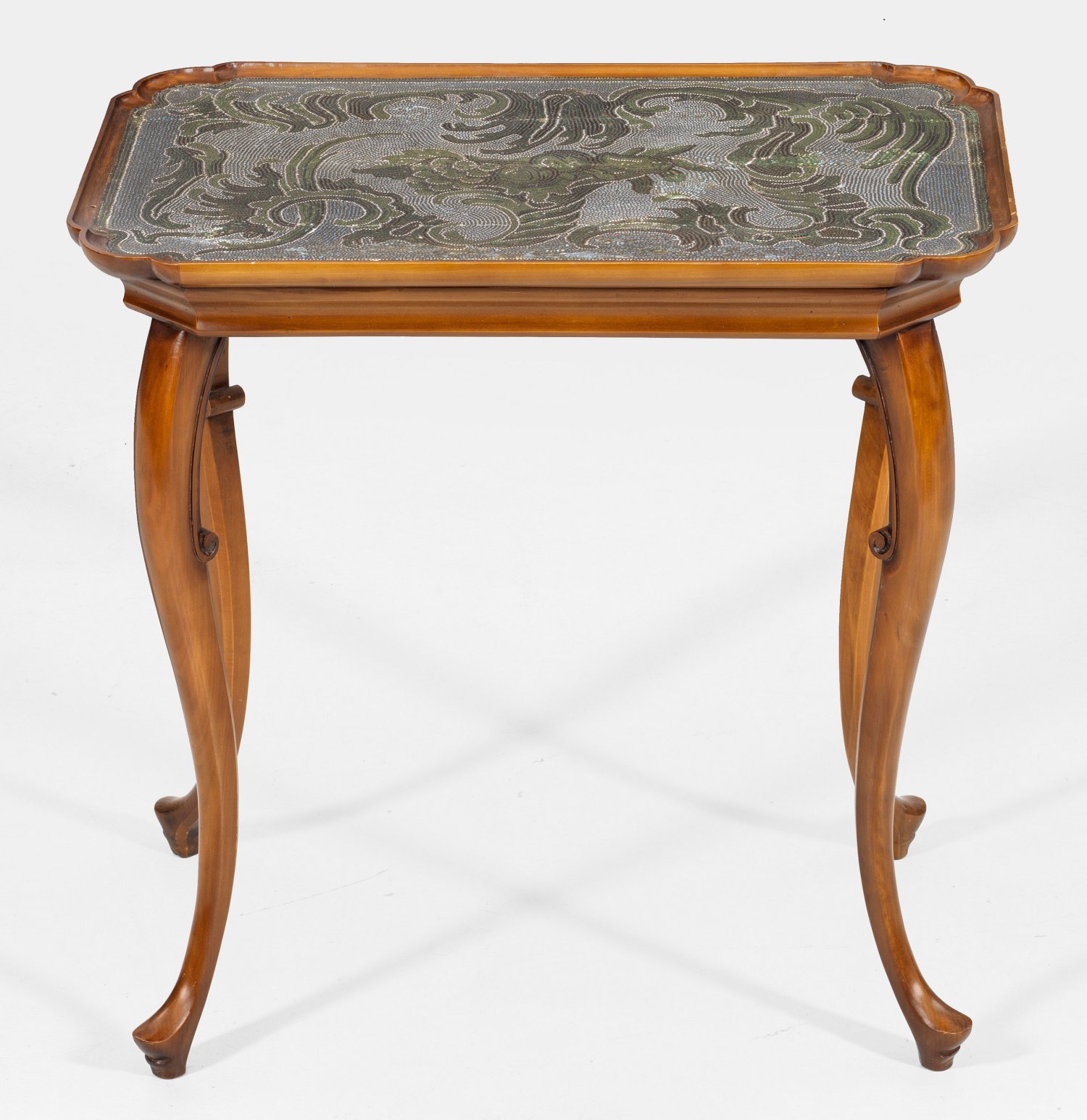 Nussbaum. Gerade Zarge auf hohen, geschwungenen Beinen. Rechteckige Deckplatte mit gerundeten Ecken und flacher Galerierahmung. Im Spiegel flächendeckendes Perlmosaik aus zentralem Füllhorn sowie großzügig angelegten Rocaillen in unterschiedlichen Grün- und Blautönen sowie Weiß. Teilw. alt rest.; Gestell erg.; H. 69,5 cm. 70,5 cm x 45,5 cm.