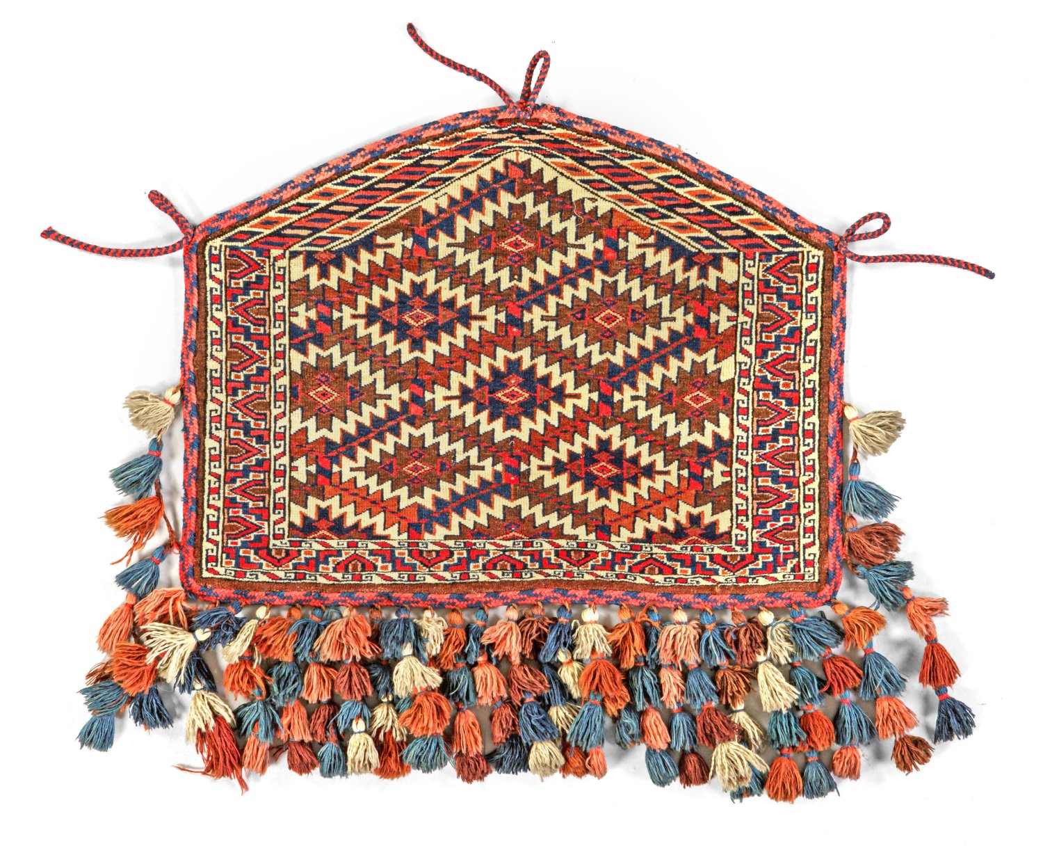 Turkmenistan. Um 1920-1930. Wolle auf Wolle. Im Innenfeld flächendeckende Rautenmusterung sowie umlaufend breite Ornamentbordüre. Üppiger Quastenbehang in Rot-, Blau- und Beigetönen. 80 cm x 60 cm.