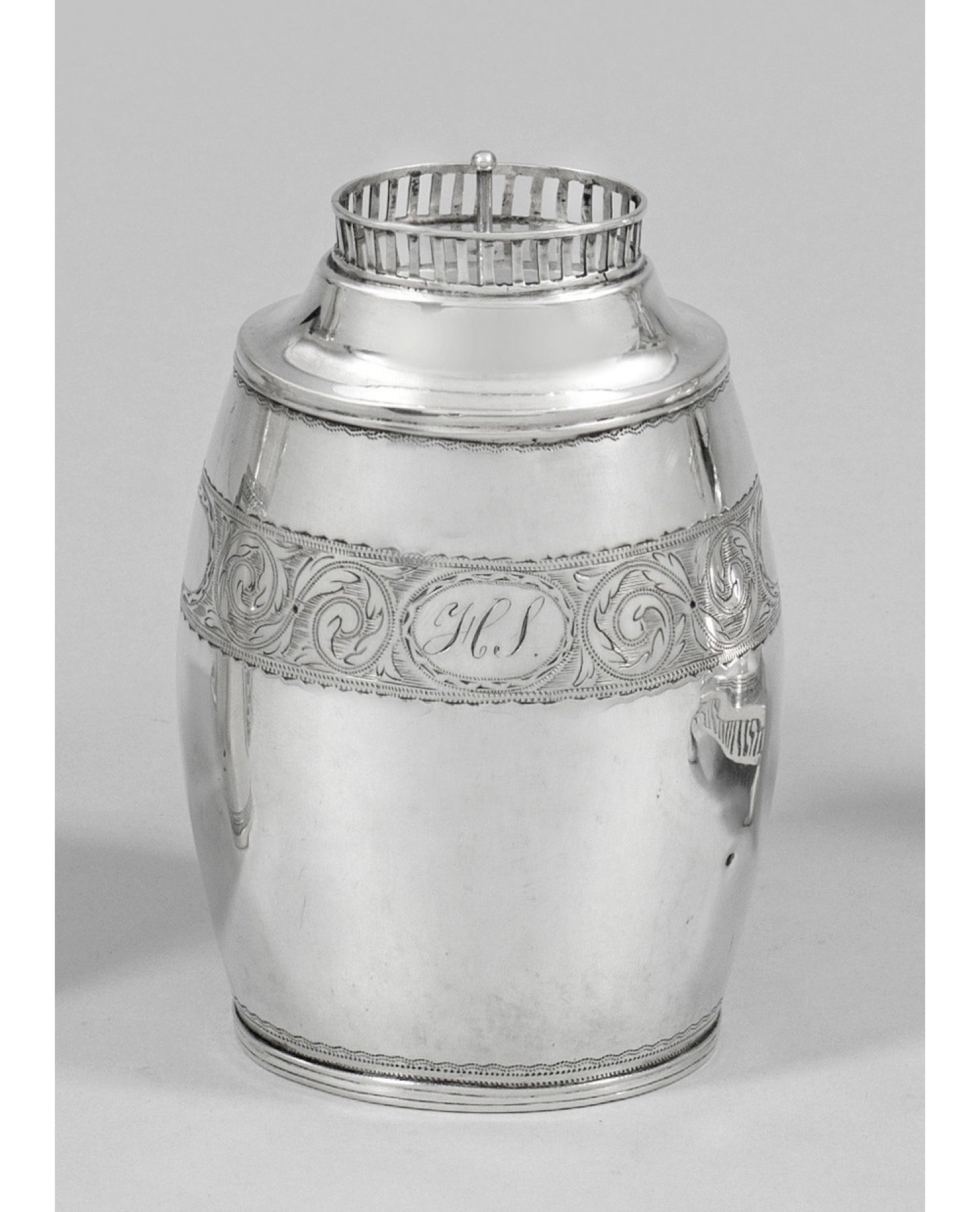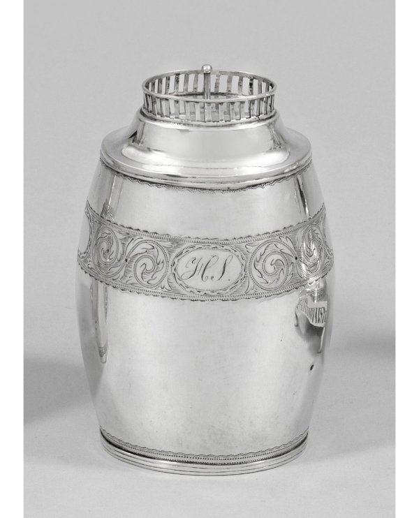 Silber. Ovaler, fassähnlicher, glatter Korpus mit abgesetzter, profilierter Schulter in durchbrochen gearbeitetem, schmalem Galerierand endend. Flacher, ovaler Deckel. Wandung umzogen von fein ziseliertem, breitem Band aus volutierten Blattranken. Schauseitig und rückseitig in ovaler Kartusche ein ligiertes Monogramm bzw. dat.; Gew. ca. 125 g. H. 12 cm.