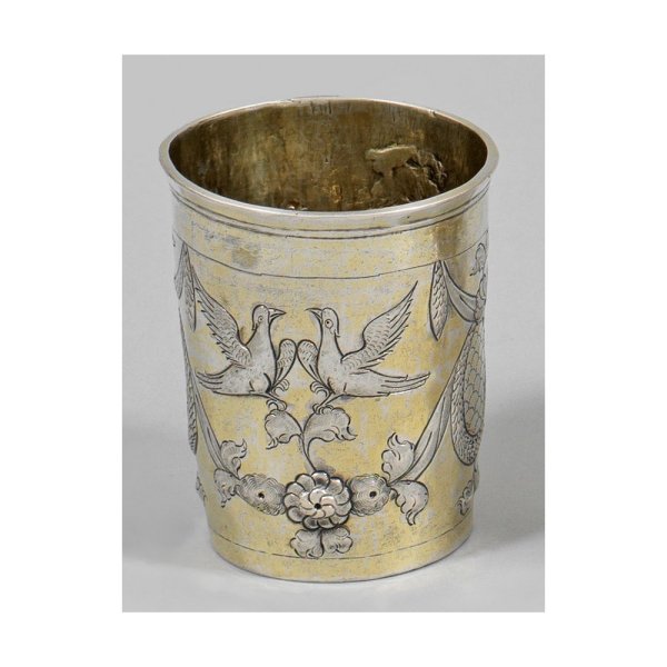 Silber. Gering konisch, mit schmalem Lippenrand. Umlaufend reliefierte Festons aus Tüchern, geschmückt mit Blüten und Blättern, in zwei ovoiden, von Blattkränzen gerahmten Kartuschen endend. In den Zwischenräumen je zwei turtelnde Taubenpärchen. Gest., Stadtmarke, Beschaumeister Alexej Iwanow Wichlajew sowie nicht identifizierbarer Alderman O.P., Meister Stephan/Semenow Saweljew (tätig ab 1787). Gew. ca. 70 g. H. 8 cm.
