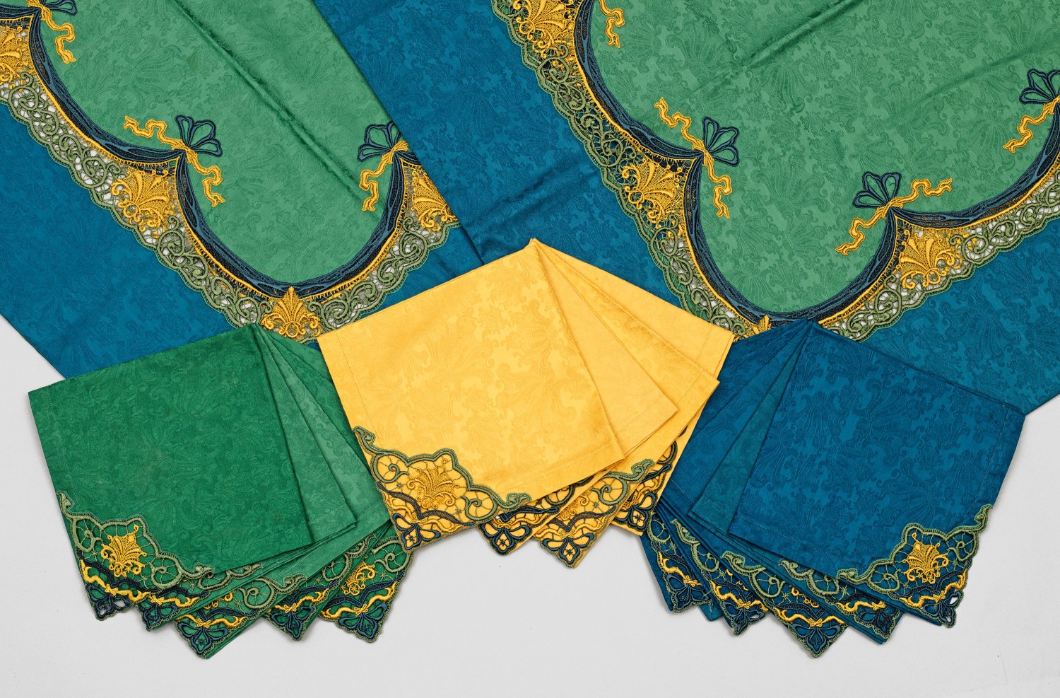 16-tlg; Rechteckiges Tafeltuch, quadratische Tischdecke und 14 Servietten. Baumwolle. Hellgrünes Innenfeld, begrenzt von passig geschweifter, durchbrochen gearbeiteter Spitzenrahmung in Gelb, Grün und Blau sowie umlaufend breiter blauer Abschluss. Korrespondierende Servietten in unterschiedlichen Farben. Herstellerzeichen. Teilw. Verkaufsetikett und teilw. Gebrauchsspuren. 265 cm x 180 cm.143 cm x 143 cm bzw. 46 cm x 46 cm.