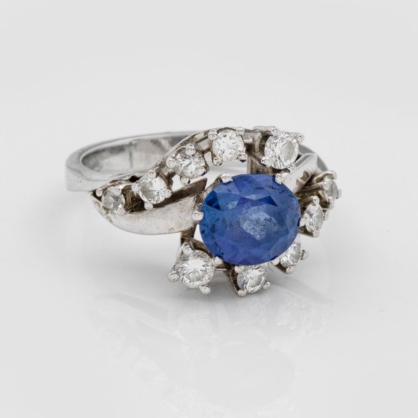 Weißgold, gest. 585. Zentral besetzt mit einem violettblauen Tansanit von ca. 1,50 ct. im Ovalschliff, entouriert von Diamanten. Gew. ca. 6,64 g.