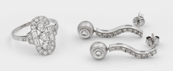Platin und Weißgold, gest. PLAT/750. Ring und ein Paar Ohrgehänge. Schauseitig besetzt mit Brillanten von zus. ca. 1,00 ct., umzogen von feinen Millegriffbändern. Ges.-Gew. ca. 8,33 g.