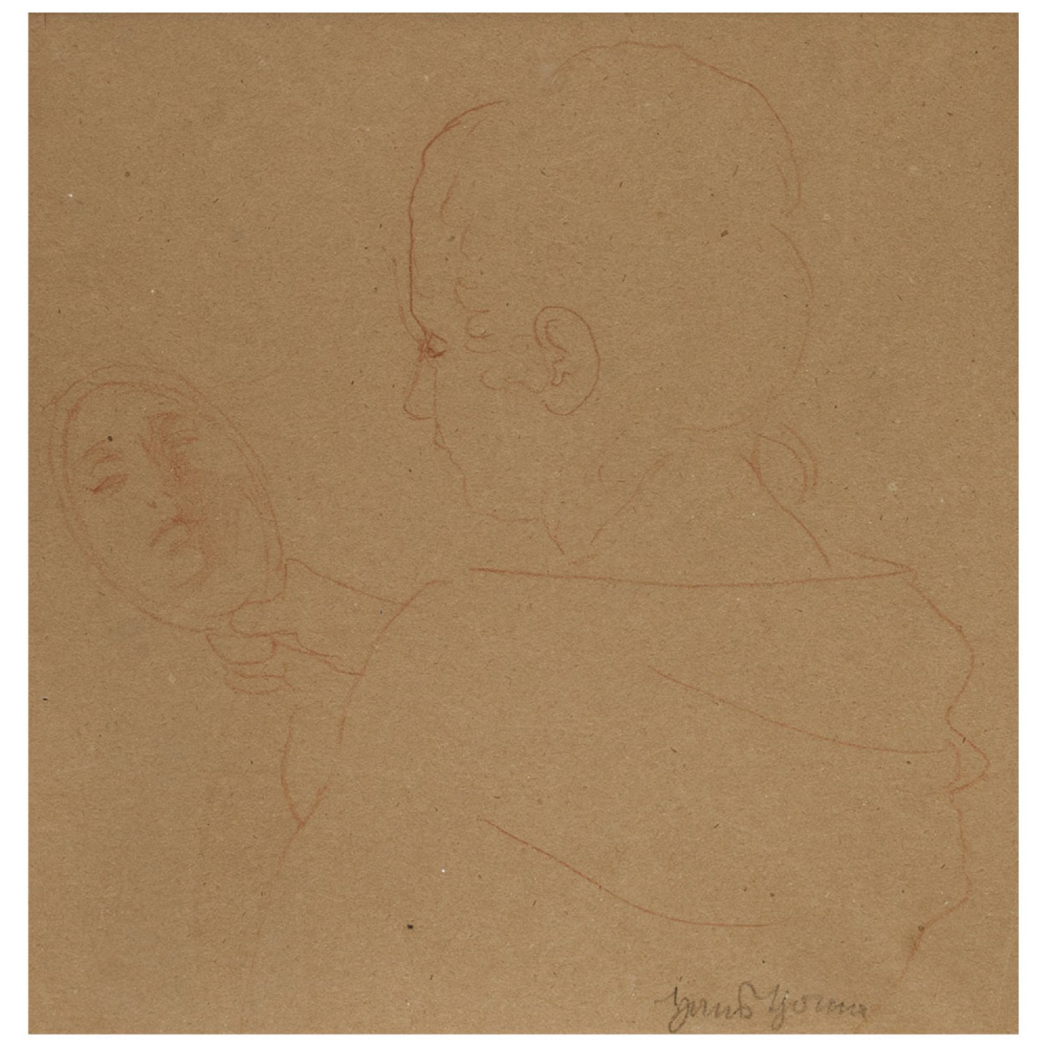 Red chalk on brownish paper. Signed.