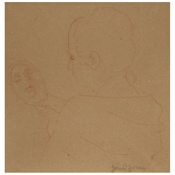Mit gekonnt flüchtigen Strichen verfasste Studie einer jungen Frau in Rückenansicht, sich in einem ovalen Handspiegel betrachtend. Rötelzeichnung/bräunliches Papier. R. u. sign.; Passepartoutausschnitt 25,5 cm x 25,5 cm. Rahmen.