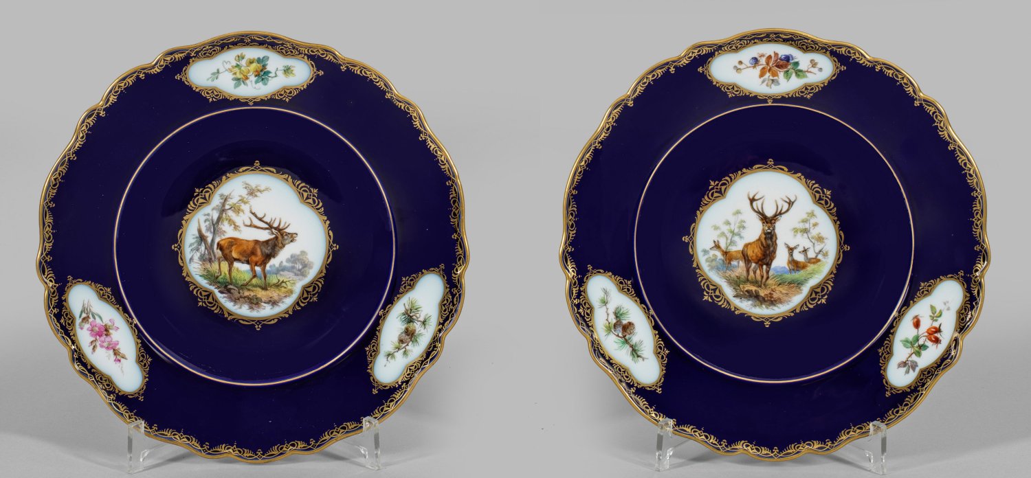 Runde, leicht vertiefte Form. Im Spiegel und auf der Fahne, in kobaltblauem Fond ausgesparte Goldornamentreserven mit Darstellung von Hirschen, teilw. Rehen bzw. Blumen- und Früchtezweigen in polychromer Malerei. Umlaufende Goldspitzenbordüre. Schwertermarke. D. 26 cm.