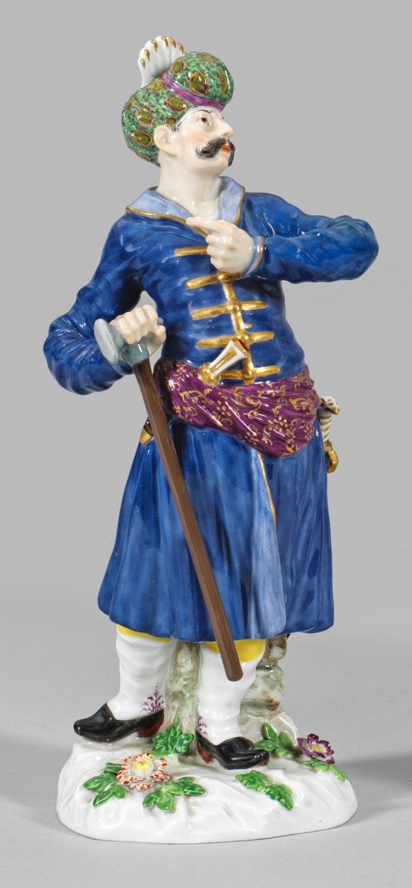 Auf einem, mit plastischen Blüten belegtem Sockel stehender, orientalisch gekleideter Mann mit geschmücktem Turban. Nach Vorlage der Orientalendarstellungen von M. Ferriol. Polychrome Malerei mit reicher Goldstaffage. Entw. J. J. Kaendler und P. Reinicke. Modell-Nr. 1294. Unw. rest.; Schwertermarke. H. 22,5 cm.