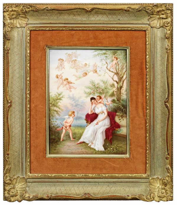 Rechteckige Bildplatte mit Darstellung einer frühlingshaften Landschaft mit Flusslauf. Auf einer Louis-XVI Bank sitzende, junge Dame im Empirekleid. Nahe ein Putto ihr etwas ins Ohr flüsternd bzw. seitlich stehender, beobachtender Amor mit Bogen. Oberhalb schwebende Schar von musizierenden bzw. spielenden Amoretten. Feine, polychrome Malerei. Links unten sign. "Kramer". Eingepresste Zepter- und KPM-Marke mit Nr. 255-195. Vergoldeter Stuckrahmen mit Eckverzierungen und Samtblende. Platte 25,5 cm x 19 cm. 47 cm x 41 cm.