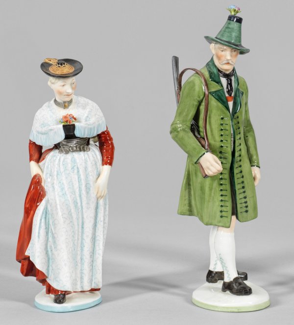 Auf flacher Plinthe stehende Dame in Miesbacher Tracht bzw. Jäger in traditioneller Tiroler Kleidung. Polychrome Malerei, teilw. mit Goldstaffage. Entw. Resl Schröder-Lechner, 1937. Manufakturmarke. H. 19,5 cm - 23,5 cm.