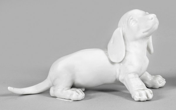 Weißporzellan. Vollplastische Darstellung eines Dackels. Entw. Konrad Schmid. Manufakturmarke. H. 8 cm.