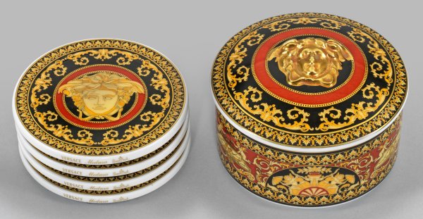 A 5-piece set of a lidded box and four coasters with decor "Medusa" from the collection "Rosenthal meets Versace". Manufacturer's mark.