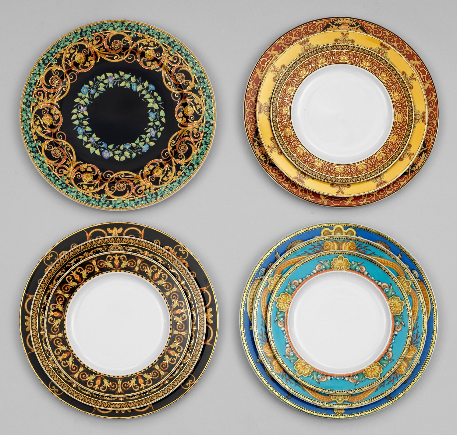 10-tlg.; 3 Platz-, 3 Speise- und 3 Vorspeisen- (oder Frühstücks-) teller sowie ein Platzteller. Farbiger Dekor "Medusa", "Les Trésors de la Mer", "Barocco" und "Gold Ivy" mit Golddekoration. Manufakturmarke. D. 22,5 cm - 31 cm.