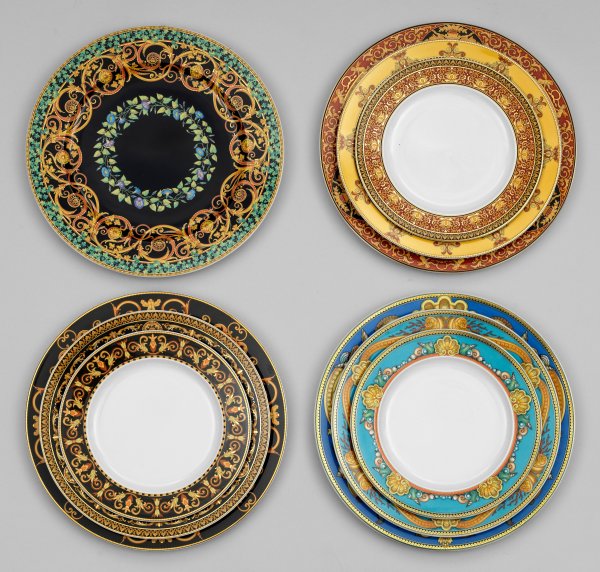 A 10-piece lot consisting three place settings and a large plate with decor "Medusa", "Les Trésors de la Mer", "Barocco" and "Gold Ivy" from the collection "Rosenthal meets Versace". Manufacturer's mark.