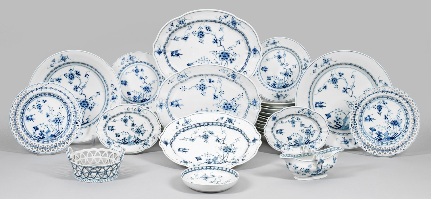sog. Seckendorff Service. 31-tlg.; 7 Speise-, 12 Suppenteller, Sauciere, 3 kleine Anbietschalen, durchbrochen gearbeiteter Korb und 2 Teller, 3 Bratenplatten, 2 große Anbietschalen. Chinesischer Dekor "Fels und Vogel", teilw. umgeben von stilisierten Blütenzweigen und Insekten. Unterglasurblaue Malerei. Maler Georg Friedrich Geisler bzw. Johann Christof Kind. Maler-Sign. "G" und "K". Teilw. minim. best.; Manufakturmarke. Korb-H. 8 cm. Platten-L. 38 cm.