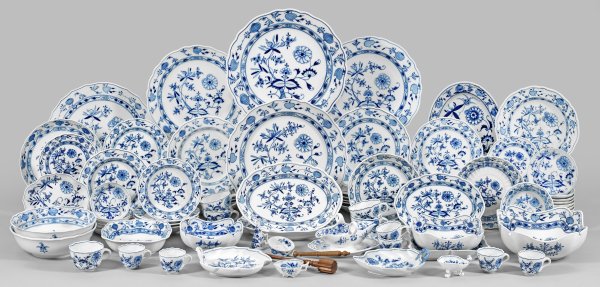 88-tlg.; 6 Mokka-, 5 Kaffeetassen mit Untertassen, 8 Vorspeisen-, 6 Speise-, 5 Suppen-, 9 Brot-, 8 Dessert-, 6 Kuchenteller, 4 Braten-, 4 Anbietplatten, Tortenplatte, 4 Salat-, 11 Beilagen-, 2 Konfektschalen, Sauciere, Kompott- und drei Löffelschälchen, Schöpfsieb, 2 Salieren, Löschhütchen. Unterglasurblauer Zwiebelmusterdekor. Beigabe: 5 Teichert-Untertassen, gedrechselter Holzquirl. Teilw. best./Haarriss. Schwerter- und Manufakturmarke. Platten-L. 24 cm - 34 cm. D. 34,5 cm - 35 cm.
