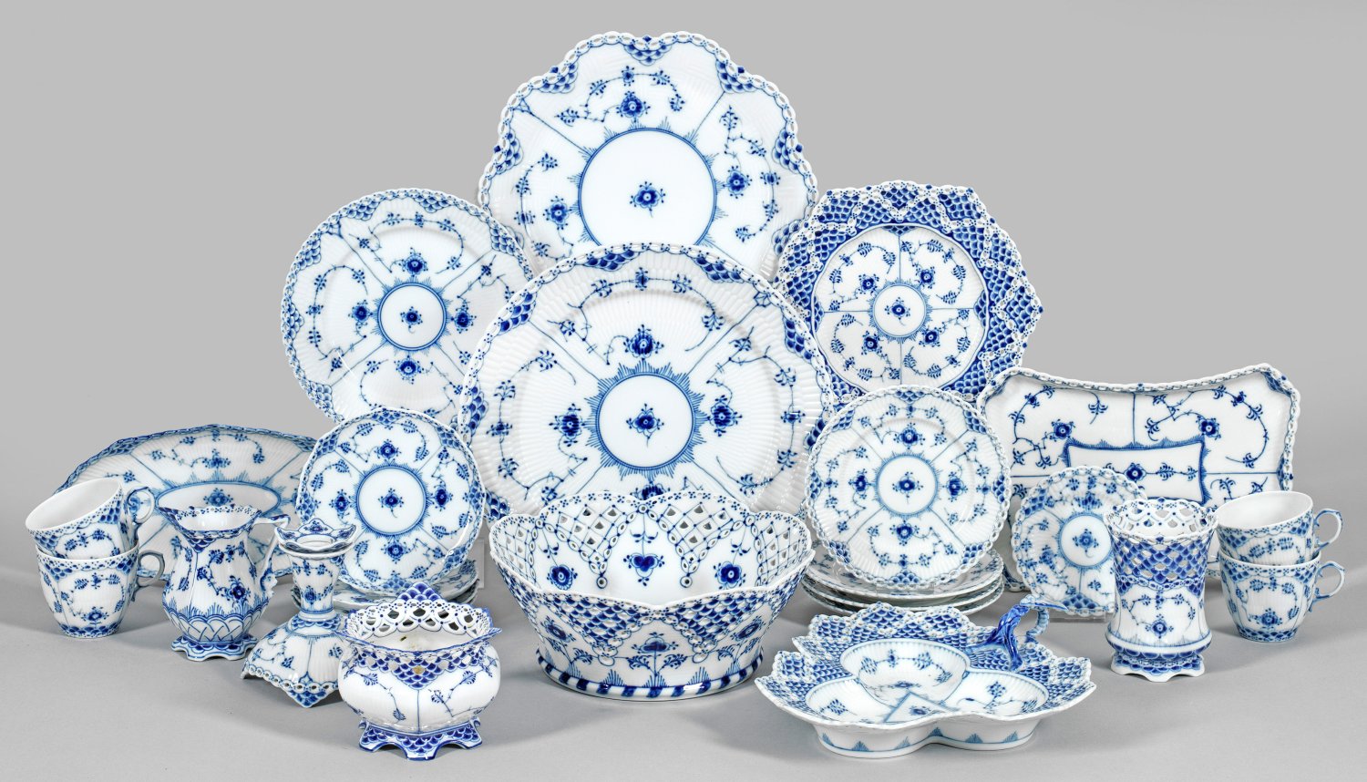 für vier Personen. 21-tlg.; Sahnekännchen, Zuckerschale, 4 Kaffeetassen mit Untertassen, 5 Anbietteller, 4 Anbietschalen, Kerzenleuchter mit abnehmbarer Traufschale, Stangenvase. Reliefdekor "Gebrochener Stab" mit "Musselmalet Vollspitze"-Dekor in unterglasurblauer Malerei. Manufakturmarke. Teller-D. 11 cm - 27 cm, Schalen-H. 2 cm - 8,5 cm.