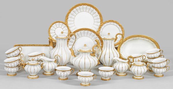 45-tlg.; 2 Kaffee-, Teekanne, 2 Sahnegießer, 2 Zuckerdosen, 17 Kaffeetassen mit Untertassen, 17 Dessertteller, kleines Tablett, 3 Anbietschalen. Sog. "X-Form". Umlaufender Blattreliefdekor in Goldbronze. Minim. best./ber.; Schwertermarke. H. 7,5 cm - 25 cm. Anbietschale oval D. 30 cm.