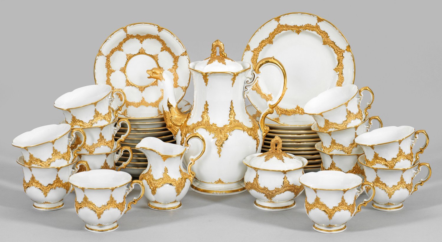 für zwölf Personen. 27-tlg.; Kaffeekanne, Milchkanne, Zuckerdose, 12 Kaffeetassen mit Untertassen, 12 Kuchenteller. Rocaillen in Glanzgold bzw. Goldbronze auf weißem Fond. Sog. "B-Form". Schwertermarke. Kannen-H. 24 cm.