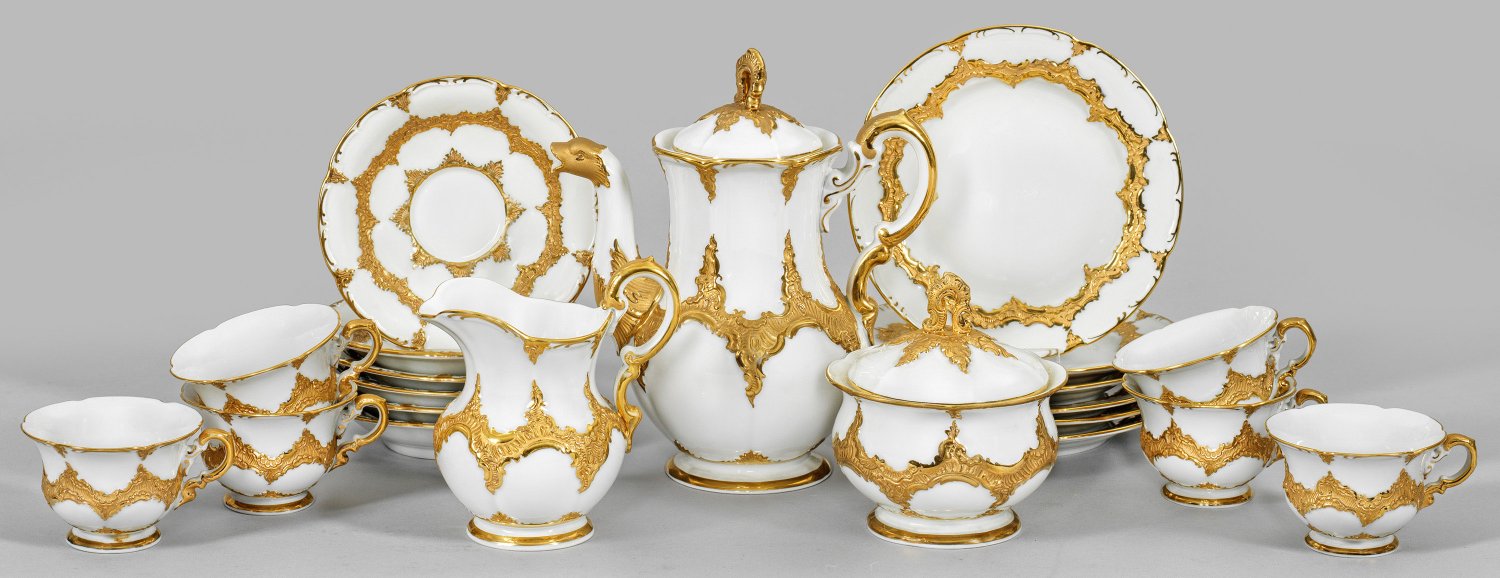 für sechs Personen. 15-tlg.; Mokkakanne, Milchkanne, Zuckerdose, 6 Mokkatassen mit Untertassen, 6 Kuchenteller. Rocaillen in Glanzgold bzw. Goldbronze auf weißem Fond. Sog. "B-Form". Schwertermarke. Kannen-H. 19 cm.