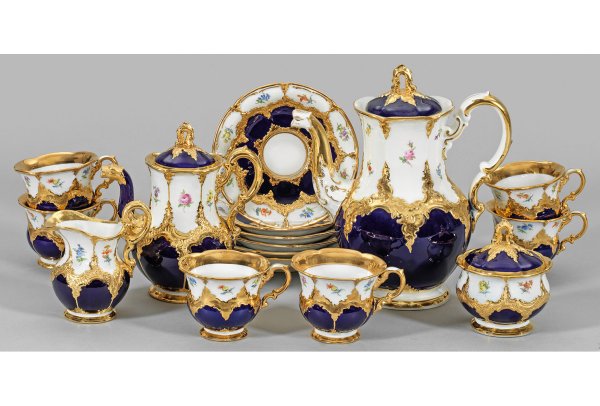 10-tlg.; Kaffee-, Mokkakanne, Milchkanne, Zuckerdose, 6 Tassen mit Untertassen. Kobaltblauer Fond mit Rocaillen in Glanzgold bzw. Goldbronze sowie mit feinen Streublumen in polychromer Malerei auf weißem Fond. Sog. "B-Form". Kaffeekanne zeitlich abweichend 2. Hälfte 20. Jh.; Teilw. rest.; Schwertermarke. Kannen-H. 19 cm - 26 cm.