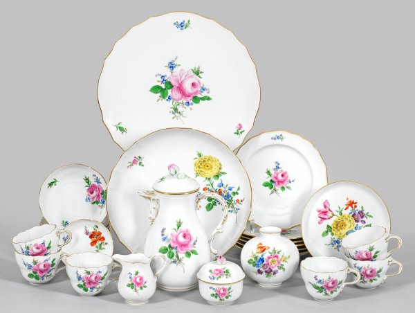 für 6 Personen. 20-tlg.; Kaffeekanne, Sahnegießer, Zuckerdose, 6 Kaffeetassen mit Untertassen, Untertasse um 1900, 6 Kuchenteller, 2 Anbietschalen, Kuchenplatte, Vase. Rosendekor in polychromer Malerei. Goldrand. Untertasse um 1900 minim. best.; Schwertermarke. Kannen-H. 24 cm. Platten-D. 32,5 cm. Vasen-H. 10 cm.