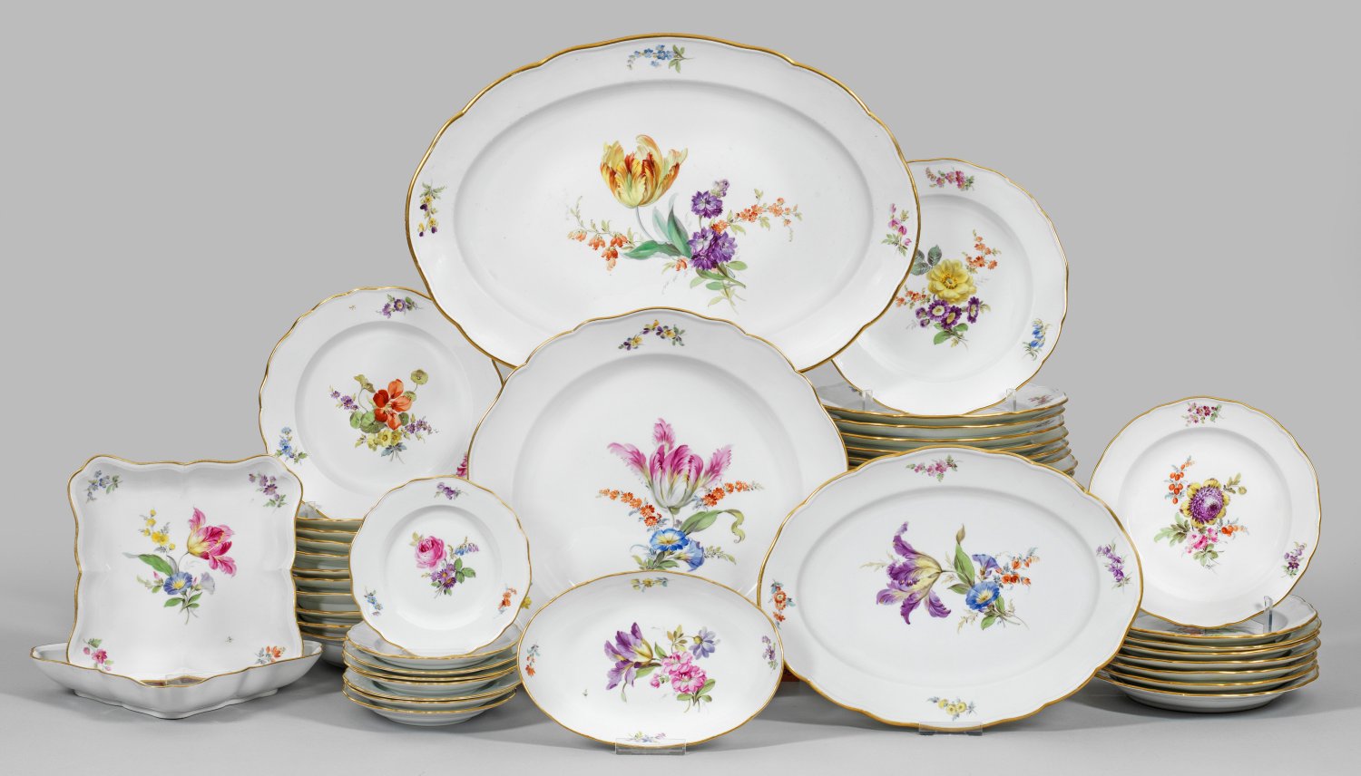 56-tlg.; 23 Speise-, 11 Suppen-, 8 Brot-, 8 Dessertteller, 2 ovale Platten, 3 Anbietschalen und ein großer Teller. Farbenfroher Blumendekor in polychromer Malerei. Goldstaffage. Minim. Brandriss; Schwertermarke. Platten-L. 46,5 cm. Teller-D. 15 cm - 34,5 cm.