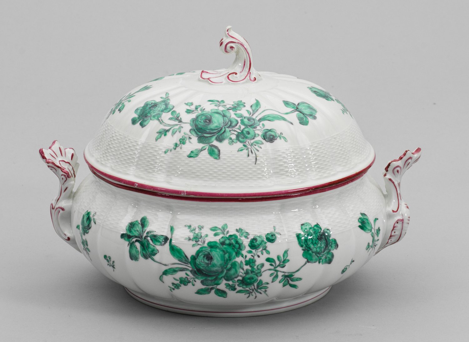 Runder, gebauchter Korpus mit gewölbtem Deckel. Seitliche Henkel und Knauf als plastische Rocaillen. "Altozier"-Relief. Blumendekor in grüner Camaieumalerei. Purpurfarbene Staffierung. Haarriss. Manufakturmarke. H. 23 cm.