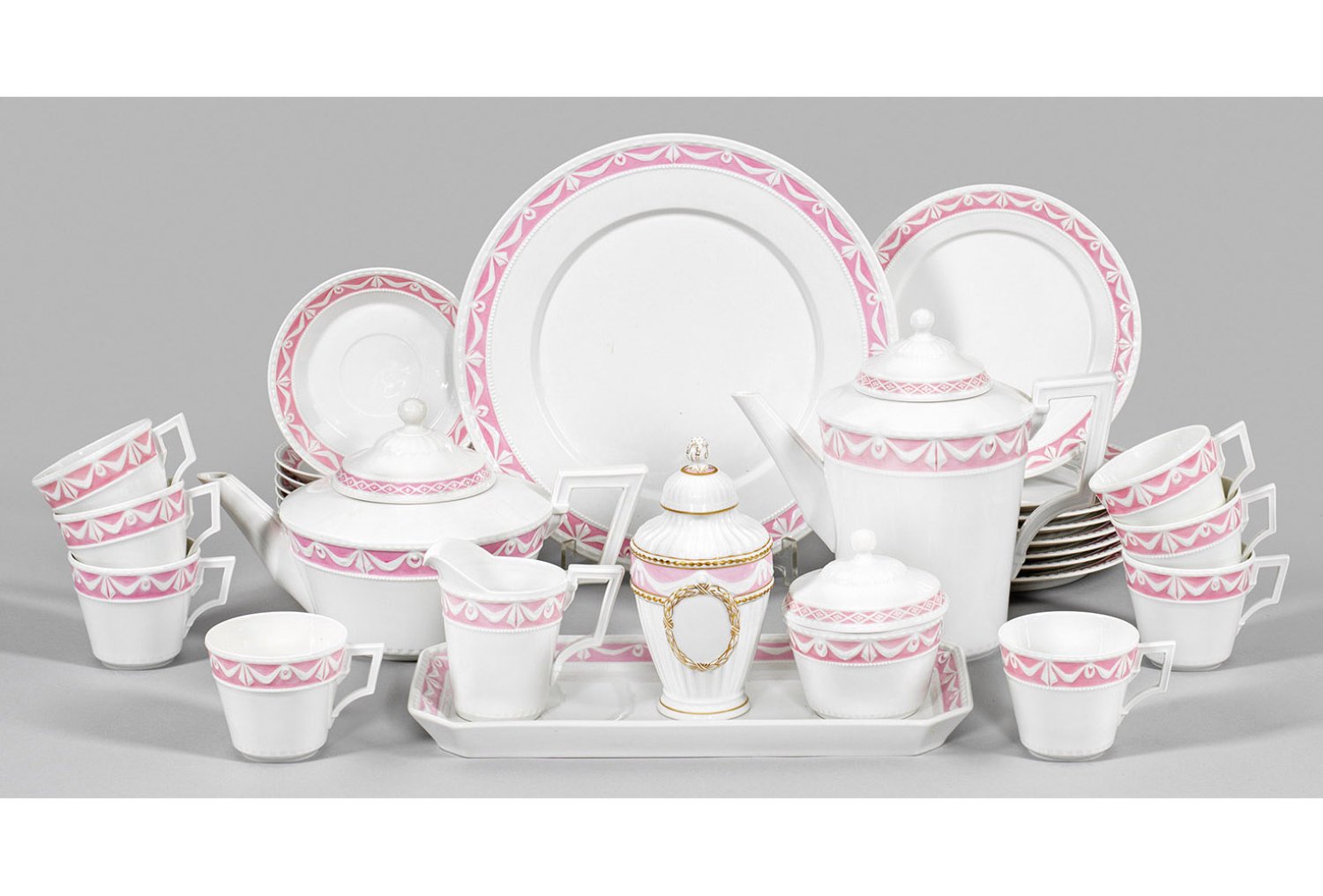 für 8 Personen. 23-tlg.; Kaffee-, Teekanne, Sahnegießer, Zuckerdose, 8 Kaffeetassen mit Untertassen, 8 Dessertteller, 2 Anbietplatten, Deckelvase. Weißporzellan. Reliefdekor "Kurland" mit bonbonrosafarbenem Fond. Knauf Deckelvase rest.; Zeptermarke. Kaffeekannen-H. 21,5 cm. Plattenmaße 29 cm - 33 cm.