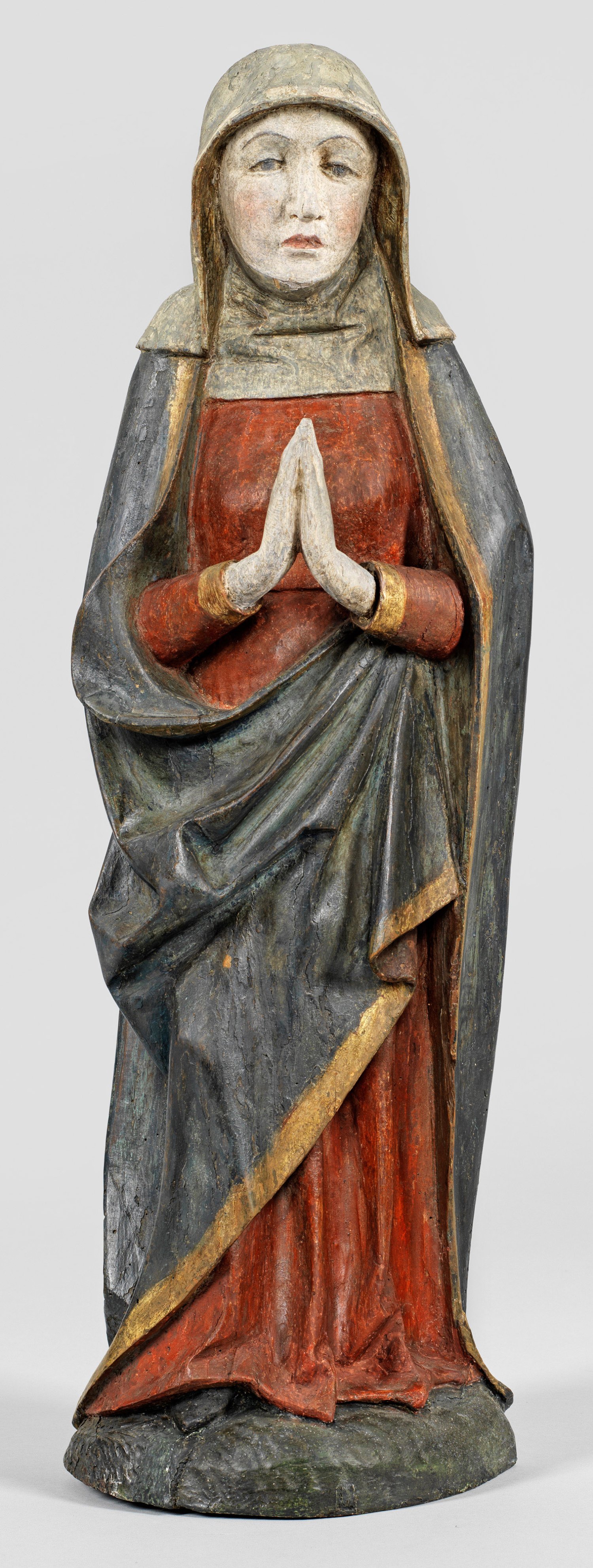 Lindenholz, fast vollplastisch geschnitzt, polychrom gefasst und vergoldet, rücks. abgeflacht. Darstellung in der Tradition spätgotischer Skulpturen. Rücks. zur unteren Partie hin wurmstichig. H. ca. 60,5 cm.