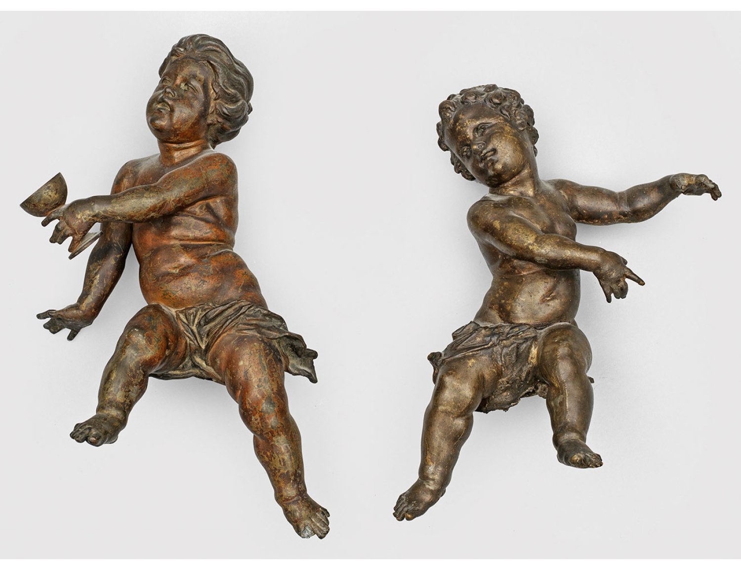 Gegenstücke. Bronze, braune Patina. Vollplastische Darstellungen eines Mädchens und eines Knaben als Putti mit um die Hüften geschlungem Tuch, mit dem Köper und den Armen nach links bzw. rechts gewandt, das Mädchen einen Kelch in der ausgestreckten linken Hand haltend. Alters- und Gebrauchsspuren, Hände und Füße partiell ger. besch.; H. ca. 37 cm-43 cm.