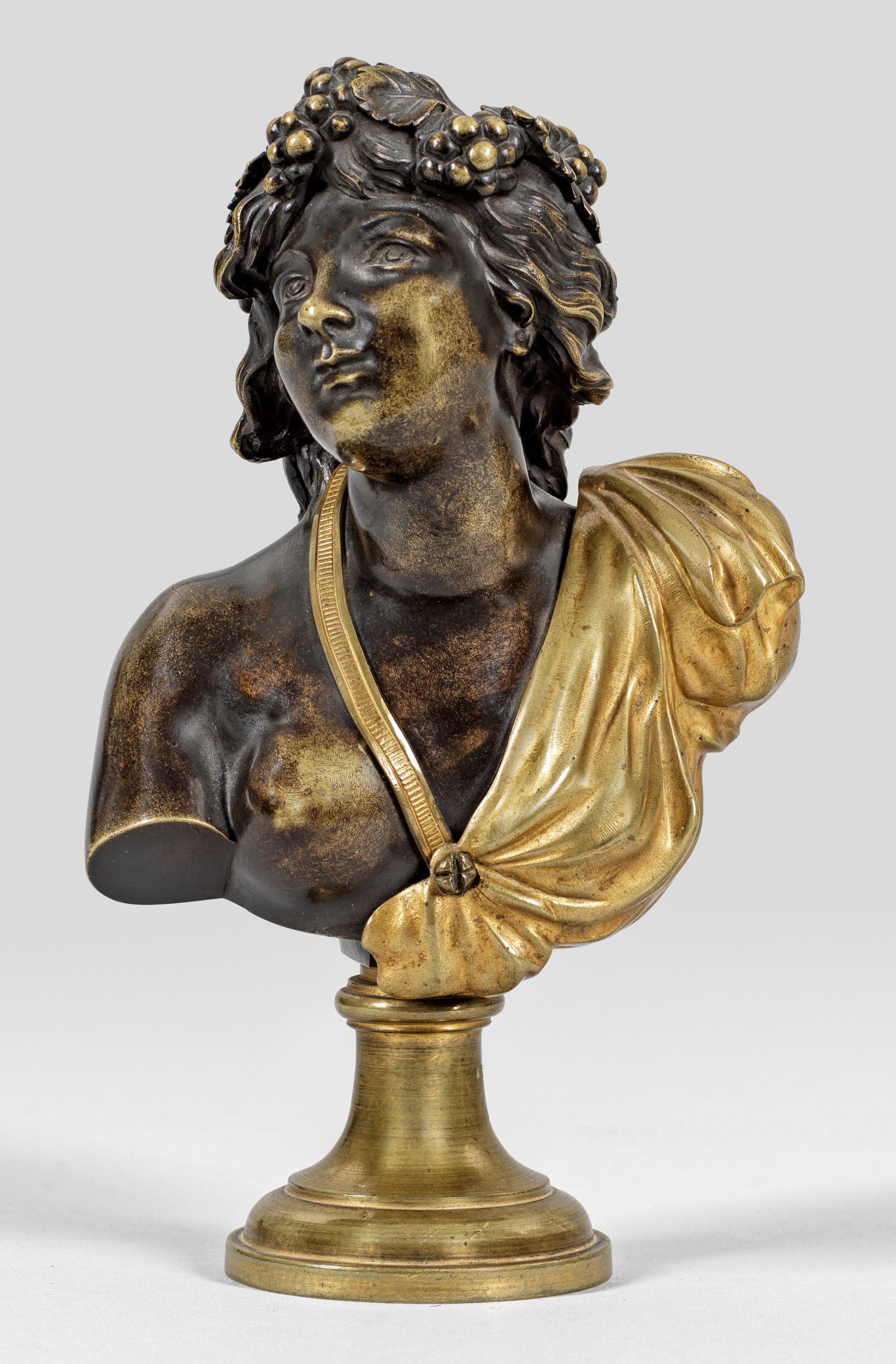 Bronze, braun patiniert und vergoldet. Auf eine hohe Säulenplinthe komponierte Büste einer jungen Bacchantin mit Weintrauben im Haar, den lächelnden, leicht geneigten Kopf ins Profil wendend, ein die rechte Brust und Schulter freilassendes Kleid tragend. Der erotische Reiz der Büste wird durch die effektvolle Zweifarbigkeit von dunklen und vergoldeten Partien gesteigert. H. 17,5 cm.