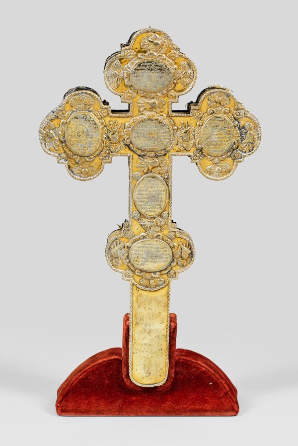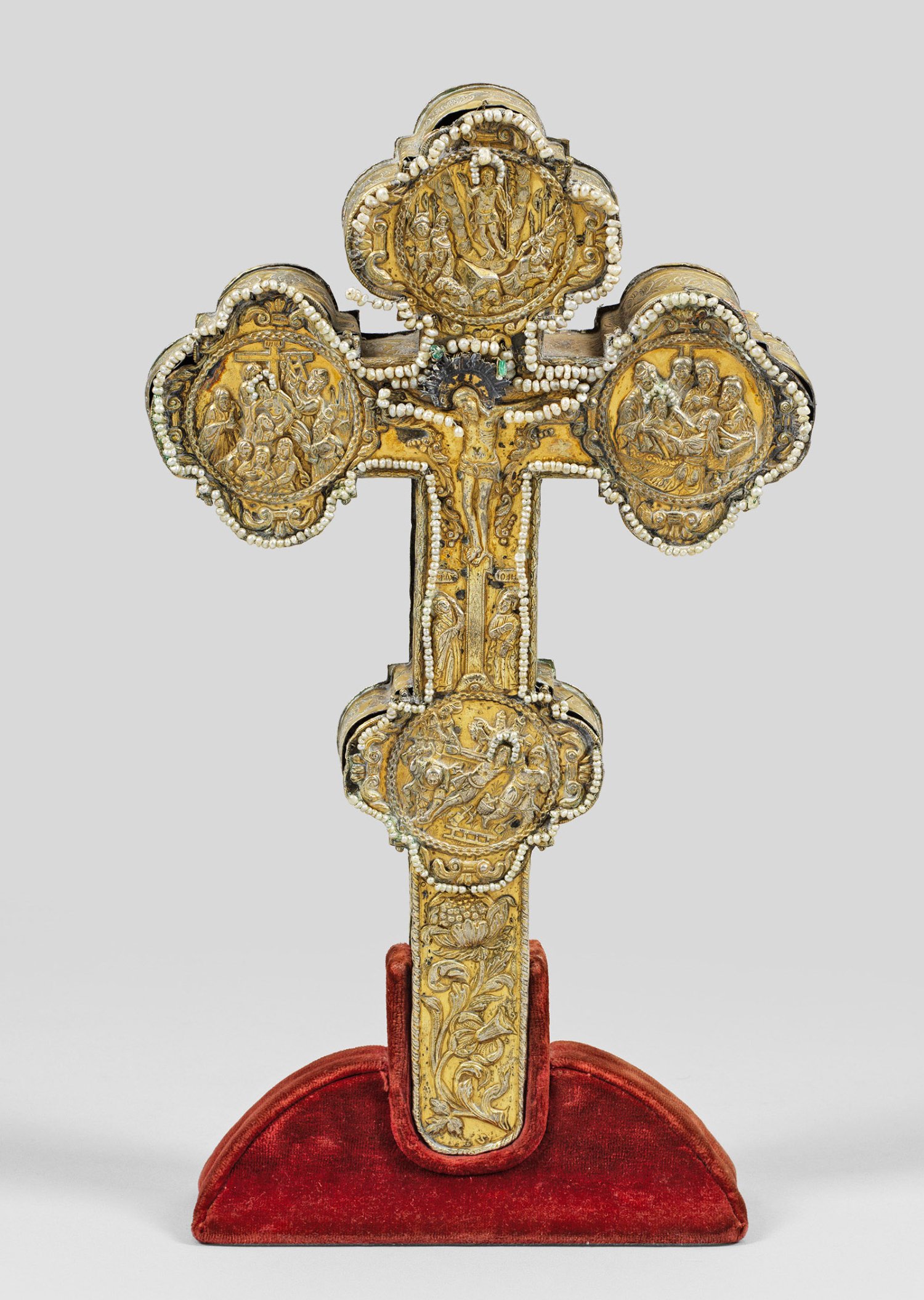 Silber, voll vergoldet. Vernietetes Kreuz, zentral mit reliefplastischer Darstellung des gekreuzigten Jesus Christus im Dreinageltypus, flankiert von Maria und dem Apostel Johannes, kyrillisch bez.; Sein strahlenförmiger Heiligenschein verziert mit zwei kleinen Smaragden. Die Kreuzenden in Form von geschweiften Dreipässen. Darauf sowie unterhalb des Gekreuzigten von Voluten und Kordelband gerahmte Rundmedaillons, mit fein getriebenen Reliefdarstellungen aus dem Passionszyklus- Kreuzigung, Kreuzabnahme, Grablegung und Auferstehung Christi. Die Ränder, die ausgestreckten Arme Christi sowie sein Heiligenschein mit umlaufend applizierten sowie auf feinem Draht aufgezogenen Saatperlen akzentuiert. Am Ansatz ein getriebener Blütenzweig. Rückseitig sechs hoch- und querovale Kartuschen mit kyrillischen Inschriften, gerahmt von fein ausgearbeitetem Volutendekor, Muschelwerk sowie großen Blüten. Die Schmalseiten umlaufend mit fein ziselierten Blatt- und Blütenranken verziert. Später erg. ein passiger Sockel mit Spange zum Einklemmen des Kreuzes, mit rotem Samt bezogen. Gest., unbekannter Meister "GS". Gew. ca. 660 g. H.39,5 cm. 21,5 cm x 3,5 cm.