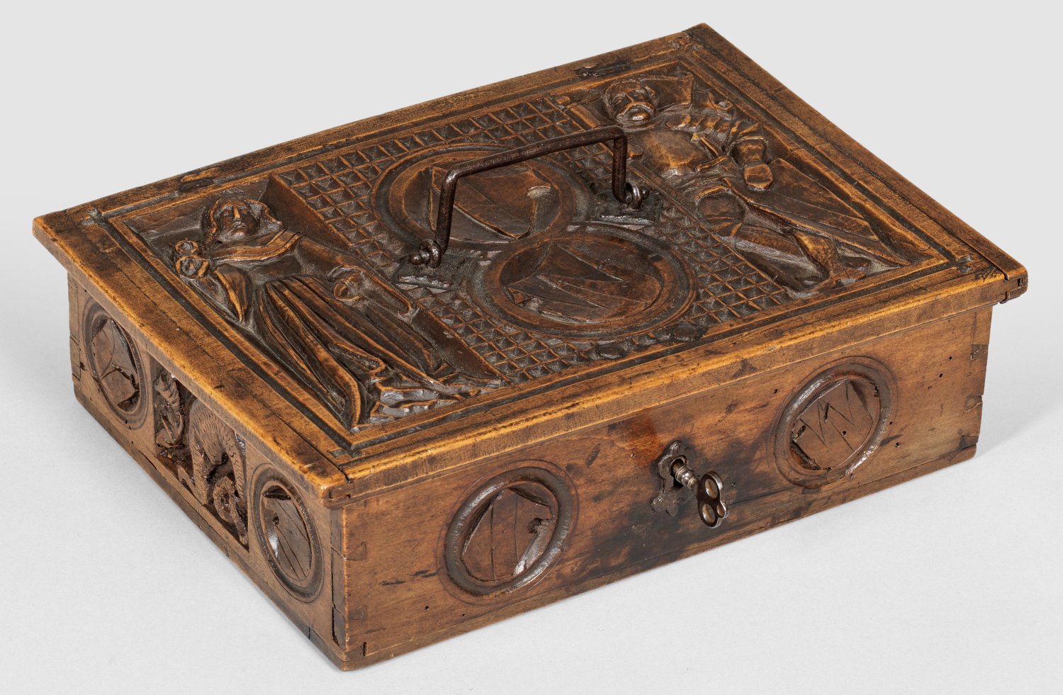 Nussbaum, teilw. reliefplastisch geschnitzt. Gerader, querrechteckig angelegter Korpus mit gering überstehendem Flachdeckel und geschmiedetem Bügelhenkel. In der Front und an den Seiten geschnitzte Wappenmedaillons und reliefierte Teufelswesen. Auf dem Deckel geschnitzte Reliefs von Dame in höfischer Tracht mit Rose sowie Ritter mit Schild und Fahne. Dazwischen große gerasterte Reserve und reliefierte Medaillons mit den Wappen der Dargestellten, wohl aus der Familie Schilter aus Eschenbach, Kriens und Luzern. Innen später ausgekleidet mit floralem Stoff. H. 9 cm. 29 cm x 21 cm.