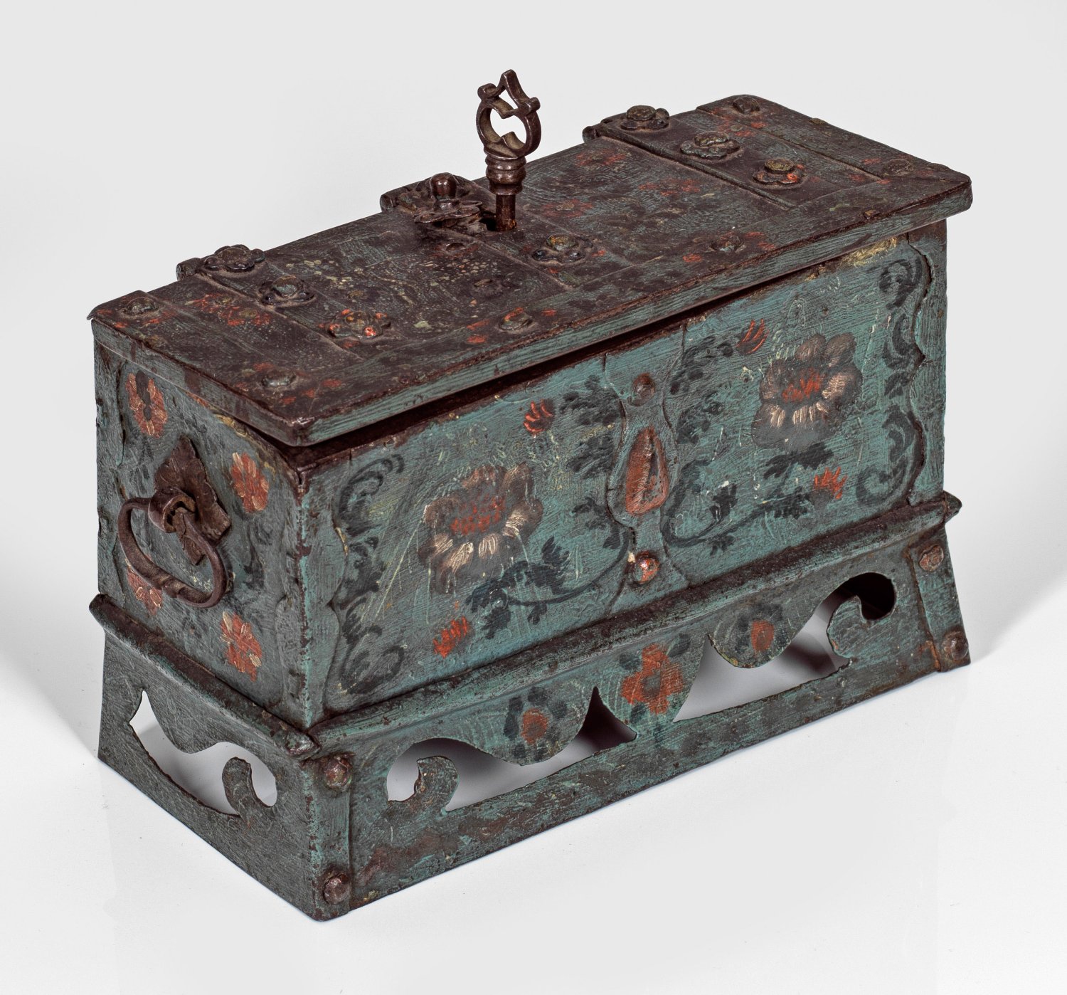 Eisen, polychrom bemalt. Gering ansteigender und volutenförmig durchbrochen gearbeiteter Stand, übergehend in länglich rechteckigen Korpus mit dreifach scharniertem, flachem Deckel, zentral mit verstecktem Schlüsselloch. Deckel und Ecken durch vernietete Bandbeschläge verstärkt. Korpus flächendeckend blau-grün bemalt und mit roten Blüten verziert. Seitliche Bügelgriffe. Innen durchbrochen gearbeitete, ziselierte Schlossabdeckung und zwei Zuhaltungen. Mit Schlüssel, Schloss fehlt. H. 13 cm. 20 cm x 9 cm.