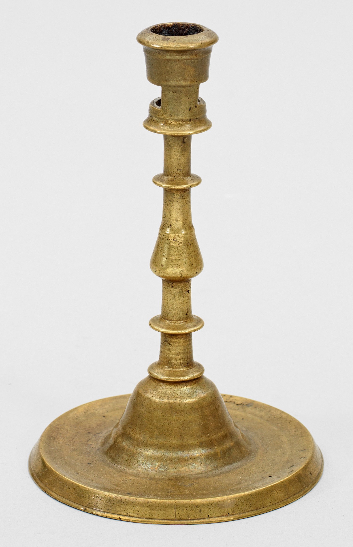 Messing. Leicht gekehlter Rundfuß über glockenförmig hochgezogener Mitte, in schlanken Schaft mit mehrfacher Scheibengliederung und -nodus übergehend. Stellenweise durch Querrillen gegliedert. Tülle mit Reinigungsöffnungen. H. 18 cm.